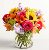 Sweetest Dream Bouquet explodes onto the scene with color and vibrant energy, set to celebrate any occasion. Beautiful fuchsia roses and yellow Asiatic Lilies pop against a bright backdrop of yellow chrysanthemums, white traditional daisies, green button poms and fresh greens. Arranged in a classic clear glass vase and accented with a satin hot pink ribbon, this bouquet is a breath of fresh air intended to uplift your special recipient's day. Deluxe